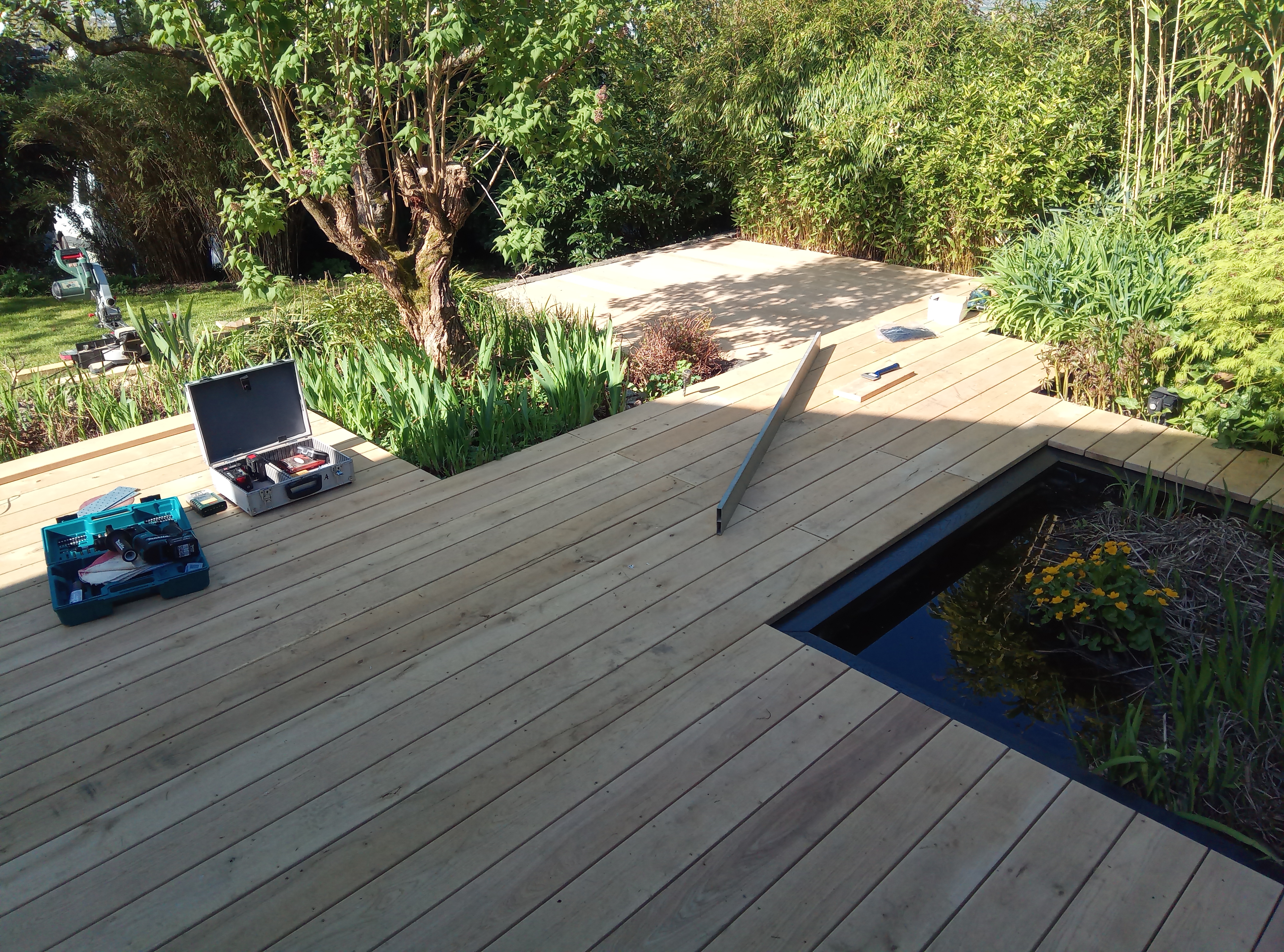 Wiederum eine Terrasse aus glatt gehobelter Eiche. Der Basalt-Quellstein und die noch zu bepflanzende Pergola bilden einen gemütlichen Rahmen für sommerliche Grillabende.